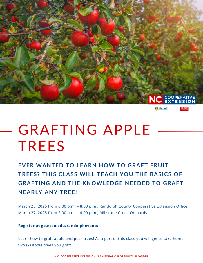 To learn more about grafting apple trees, consider joining one of the Apple Tree Grafting Workshops offered through Randolph County Cooperative Extension. In these sessions, you'll learn hands-on how to graft apple trees to rootstocks through the whip-and-tongue method. You'll get to go home with two (2) apple trees you grafted to take care of!
